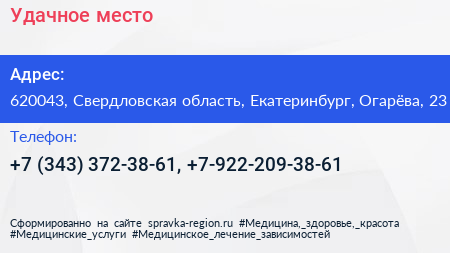 Удачное место по адресу 620043, Свердловская область, Екатеринбург, Огарёва, 23 в дальнейшем Организация, размещена в следующих категориях: