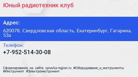 Юный радиотехник, клуб по адресу 620078, Свердловская область, Екатеринбург, Гагарина, 53а в дальнейшем Организация, размещена в следующих категориях: