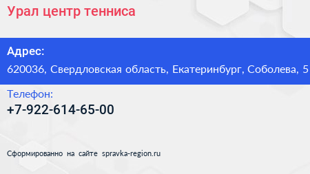 Урал, центр тенниса по адресу 620036, Свердловская область, Екатеринбург, Соболева, 5 в дальнейшем Организация, размещена в следующих категориях: