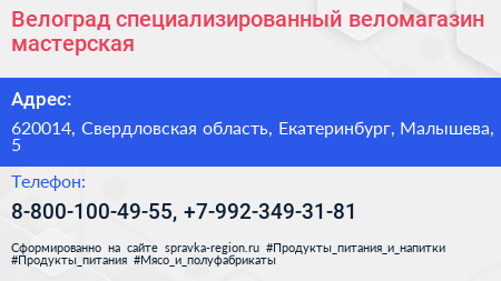 Велоград, специализированный веломагазин-мастерская по адресу 620014, Свердловская область, Екатеринбург, Малышева, 5 в дальнейшем Организация, размещена в следующих категориях: