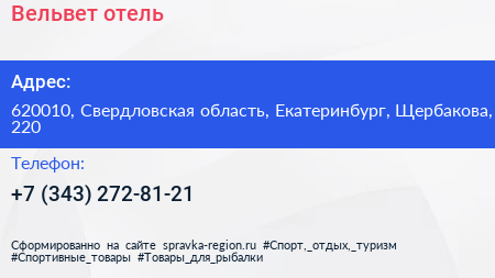 Вельвет, отель по адресу 620010, Свердловская область, Екатеринбург, Щербакова, 220 в дальнейшем Организация, размещена в следующих категориях: