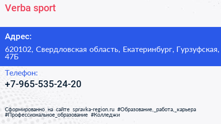 Verba sport по адресу 620102, Свердловская область, Екатеринбург, Гурзуфская, 47Б в дальнейшем Организация, размещена в следующих категориях: