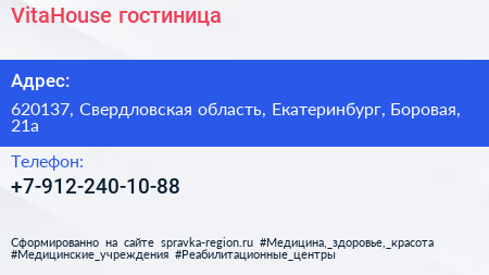 VitaHouse, гостиница по адресу 620137, Свердловская область, Екатеринбург, Боровая, 21а в дальнейшем Организация, размещена в следующих категориях: