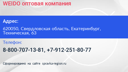 WEIDO, оптовая компания по адресу 620050, Свердловская область, Екатеринбург, Техническая, 63 в дальнейшем Организация, размещена в следующих категориях: