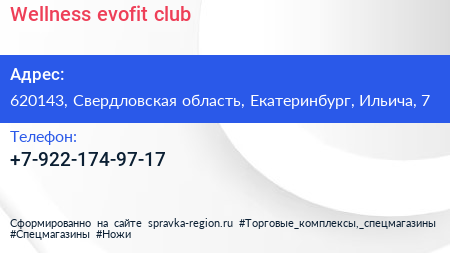 Wellness evofit club по адресу 620143, Свердловская область, Екатеринбург, Ильича, 7 в дальнейшем Организация, размещена в следующих категориях: