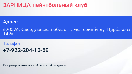 ЗАРНИЦА, пейнтбольный клуб по адресу 620076, Свердловская область, Екатеринбург, Щербакова, 149в в дальнейшем Организация, размещена в следующих категориях: