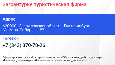 Загрантурне, туристическая фирма по адресу 620000, Свердловская область, Екатеринбург, Мамина-Сибиряка, 97 в дальнейшем Организация, размещена в следующих категориях: