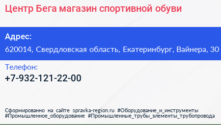 Центр Бега, магазин спортивной обуви по адресу 620014, Свердловская область, Екатеринбург, Вайнера, 30 в дальнейшем Организация, размещена в следующих категориях:
