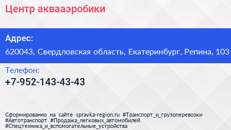 Центр аквааэробики по адресу 620043, Свердловская область, Екатеринбург, Репина, 103 в дальнейшем Организация, размещена в следующих категориях:
