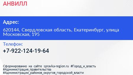 АНВИЛЛ по адресу 620144, Свердловская область, Екатеринбург, улица Московская, 195 в дальнейшем Организация, размещена в следующих категориях: