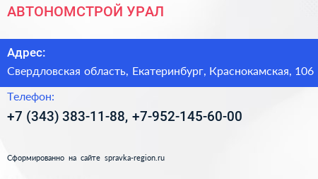АВТОНОМСТРОЙ-УРАЛ по адресу Свердловская область, Екатеринбург, Краснокамская, 106 в дальнейшем Организация, размещена в следующих категориях: