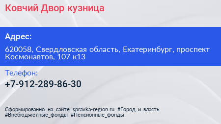 Ковчий Двор, кузница по адресу 620058, Свердловская область, Екатеринбург, проспект Космонавтов, 107 к13 в дальнейшем Организация, размещена в следующих категориях: