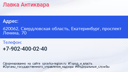 Лавка Антиквара по адресу 620062, Свердловская область, Екатеринбург, проспект Ленина, 70 в дальнейшем Организация, размещена в следующих категориях:
