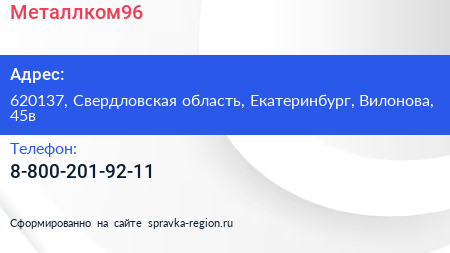 Металлком96 по адресу 620137, Свердловская область, Екатеринбург, Вилонова, 45в в дальнейшем Организация, размещена в следующих категориях: