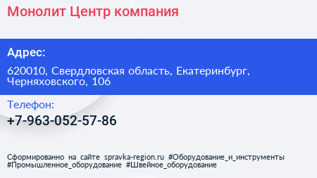 Монолит-Центр, компания по адресу 620010, Свердловская область, Екатеринбург, Черняховского, 106 в дальнейшем Организация, размещена в следующих категориях: