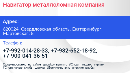 Навигатор, металлоломная компания по адресу 620024, Свердловская область, Екатеринбург, Мартовская, 8 в дальнейшем Организация, размещена в следующих категориях: