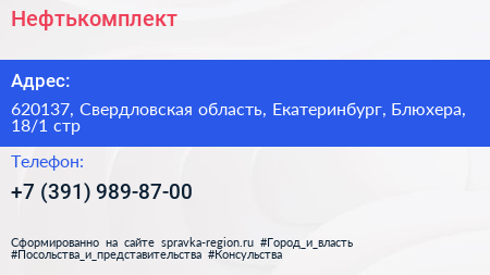 Нефтькомплект по адресу 620137, Свердловская область, Екатеринбург, Блюхера, 18/1 стр в дальнейшем Организация, размещена в следующих категориях: