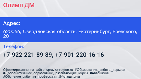 Олимп-ДМ по адресу 620066, Свердловская область, Екатеринбург, Раевского, 20 в дальнейшем Организация, размещена в следующих категориях: