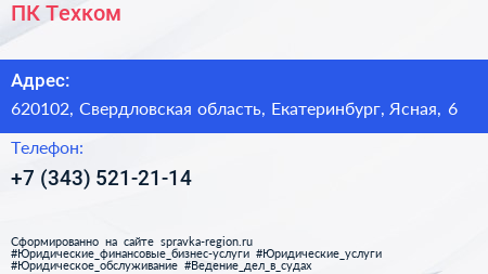 ПК Техком по адресу 620102, Свердловская область, Екатеринбург, Ясная, 6 в дальнейшем Организация, размещена в следующих категориях: