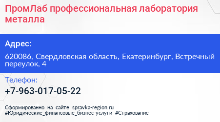 ПромЛаб, профессиональная лаборатория металла по адресу 620086, Свердловская область, Екатеринбург, Встречный переулок, 4 в дальнейшем Организация, размещена в следующих категориях: