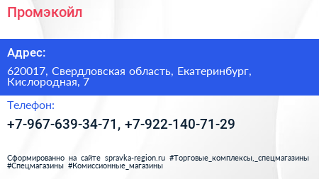 Промэкойл по адресу 620017, Свердловская область, Екатеринбург, Кислородная, 7 в дальнейшем Организация, размещена в следующих категориях: