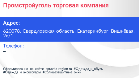 Промстройуголь, торговая компания по адресу 620078, Свердловская область, Екатеринбург, Вишнёвая, 2в/1 в дальнейшем Организация, размещена в следующих категориях: