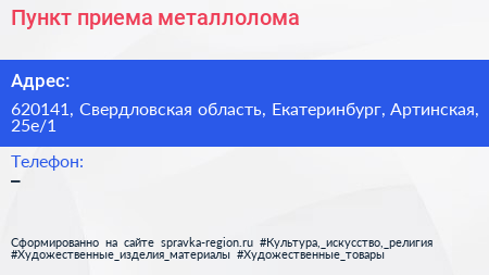 Пункт приема металлолома по адресу 620141, Свердловская область, Екатеринбург, Артинская, 25е/1 в дальнейшем Организация, размещена в следующих категориях: