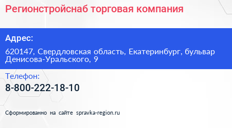 Регионстройснаб, торговая компания по адресу 620147, Свердловская область, Екатеринбург, бульвар Денисова-Уральского, 9 в дальнейшем Организация, размещена в следующих категориях:
