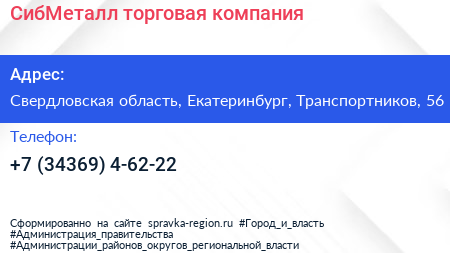СибМеталл, торговая компания по адресу Свердловская область, Екатеринбург, Транспортников, 56 в дальнейшем Организация, размещена в следующих категориях: