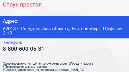 Стоун престол по адресу 620137, Свердловская область, Екатеринбург, Шефская, 2г/3 в дальнейшем Организация, размещена в следующих категориях: