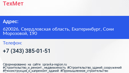 ТехМет по адресу 620026, Свердловская область, Екатеринбург, Сони Морозовой, 190 в дальнейшем Организация, размещена в следующих категориях: