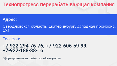 Технопрогресс, перерабатывающая компания по адресу Свердловская область, Екатеринбург, Западная промзона, 19а в дальнейшем Организация, размещена в следующих категориях: