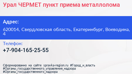 Урал-ЧЕРМЕТ, пункт приема металлолома по адресу 620014, Свердловская область, Екатеринбург, Воеводина, 4 в дальнейшем Организация, размещена в следующих категориях: