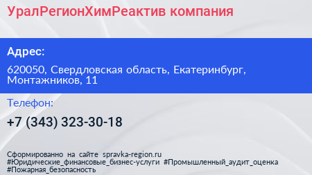 УралРегионХимРеактив, компания по адресу 620050, Свердловская область, Екатеринбург, Монтажников, 11 в дальнейшем Организация, размещена в следующих категориях: