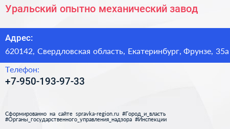 Уральский опытно-механический завод по адресу 620142, Свердловская область, Екатеринбург, Фрунзе, 35а в дальнейшем Организация, размещена в следующих категориях: