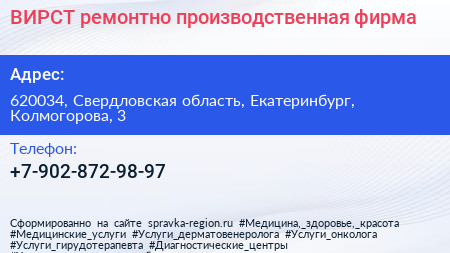 ВИРСТ, ремонтно-производственная фирма по адресу 620034, Свердловская область, Екатеринбург, Колмогорова, 3 в дальнейшем Организация, размещена в следующих категориях: