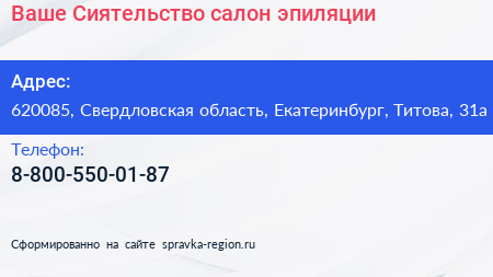 Ваше Сиятельство, салон эпиляции по адресу 620085, Свердловская область, Екатеринбург, Титова, 31а в дальнейшем Организация, размещена в следующих категориях: