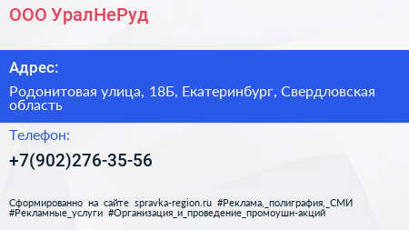 ООО «УралНеРуд» по адресу Родонитовая улица, 18Б, Екатеринбург, Свердловская область в дальнейшем Организация, размещена в следующих категориях: