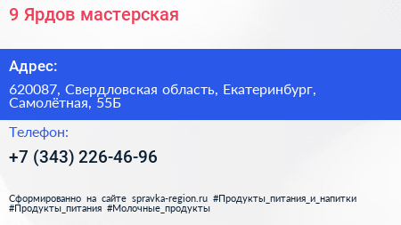 9 Ярдов., мастерская по адресу 620087, Свердловская область, Екатеринбург, Самолётная, 55Б в дальнейшем Организация, размещена в следующих категориях:
