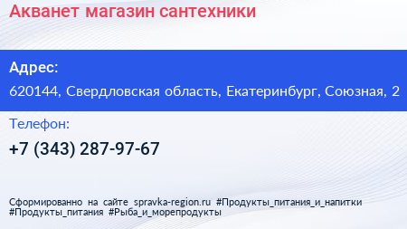 Акванет, магазин сантехники по адресу 620144, Свердловская область, Екатеринбург, Союзная, 2 в дальнейшем Организация, размещена в следующих категориях: