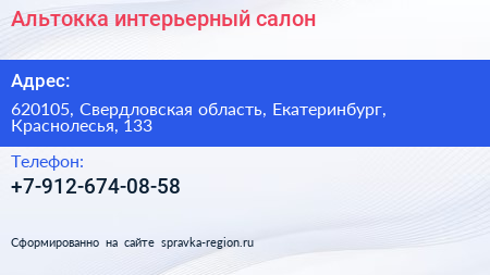 Альтокка, интерьерный салон по адресу 620105, Свердловская область, Екатеринбург, Краснолесья, 133 в дальнейшем Организация, размещена в следующих категориях: