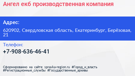 Ангел-екб, производственная компания по адресу 620902, Свердловская область, Екатеринбург, Берёзовая, 21 в дальнейшем Организация, размещена в следующих категориях: