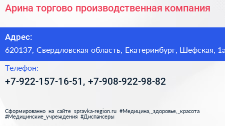 Арина, торгово-производственная компания по адресу 620137, Свердловская область, Екатеринбург, Шефская, 1а в дальнейшем Организация, размещена в следующих категориях: