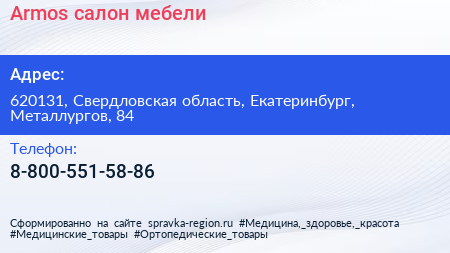 Armos, салон мебели по адресу 620131, Свердловская область, Екатеринбург, Металлургов, 84 в дальнейшем Организация, размещена в следующих категориях: