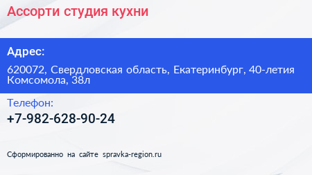 Ассорти, студия кухни по адресу 620072, Свердловская область, Екатеринбург, 40-летия Комсомола, 38л в дальнейшем Организация, размещена в следующих категориях: