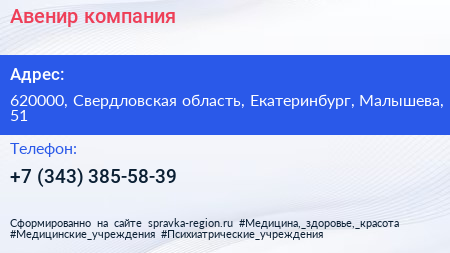 Для связи с организацией воспользуйтесь номером телефона: +7 (343) 385-58-39. Пн: c 09:00-18:00, Вт: c 09:00-18:00, Ср: c 09:00-18:00, Чт: c 09:00-18:00, Пт: c 09:00-18:00, Сб: выходной, Вс: выходной, вы можете обратиться в эту организацию.