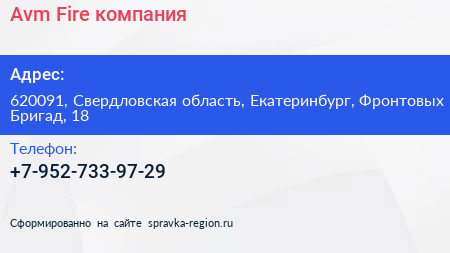 Avm Fire, компания по адресу 620091, Свердловская область, Екатеринбург, Фронтовых Бригад, 18 в дальнейшем Организация, размещена в следующих категориях: