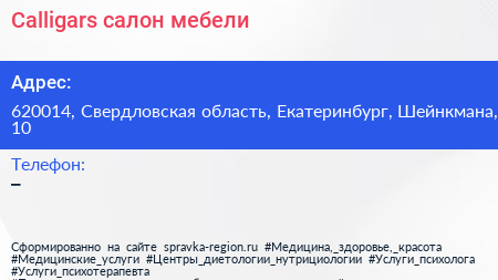 Calligars, салон мебели по адресу 620014, Свердловская область, Екатеринбург, Шейнкмана, 10 в дальнейшем Организация, размещена в следующих категориях: