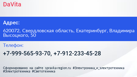 DaVita по адресу 620072, Свердловская область, Екатеринбург, Владимира Высоцкого, 50 в дальнейшем Организация, размещена в следующих категориях: