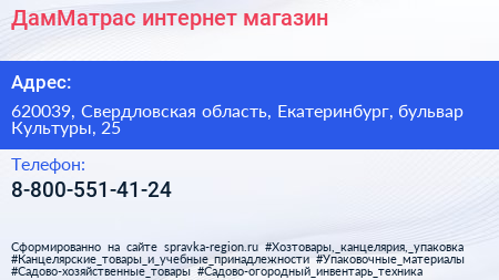 ДамМатрас, интернет-магазин по адресу 620039, Свердловская область, Екатеринбург, бульвар Культуры, 25 в дальнейшем Организация, размещена в следующих категориях: